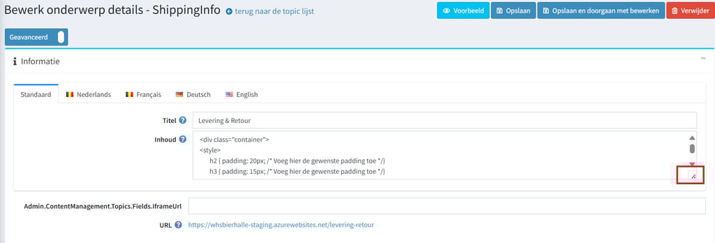 Let erop dat u de HTML-code niet aanpast. Deze HTML-code zorgt voor de opmaak van de tekst en de titels op de pagina. Pas dus alleen de tekst aan. Denkt u dat u per ongeluk een stukje HTML hebt verwijderd, druk dan op 'Terug naar de topiclijst' om te voorkomen dat de wijziging wordt opgeslagen.
