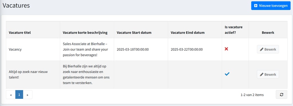 Hier ziet u de lijst met vacatures die momenteel zichtbaar zijn op uw website, en de vacatures die ooit zichtbaar waren.