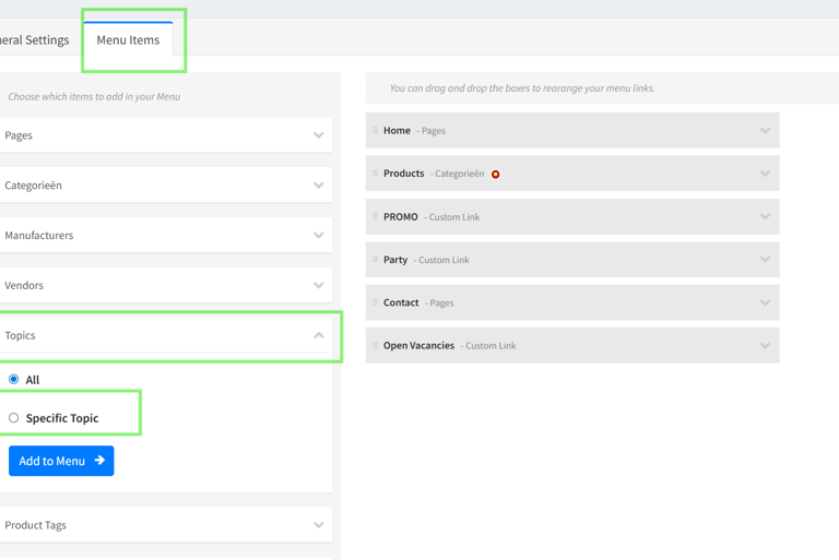 Onder 'Topics' kan je een 'Specific Topic' selecteren waarbij je je nieuwe pagina zal vinden.