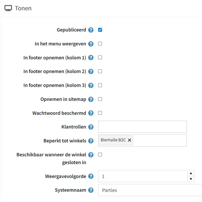 In de sectie 'Tonen' kan u beslissen waar de pagina moet getoont worden.